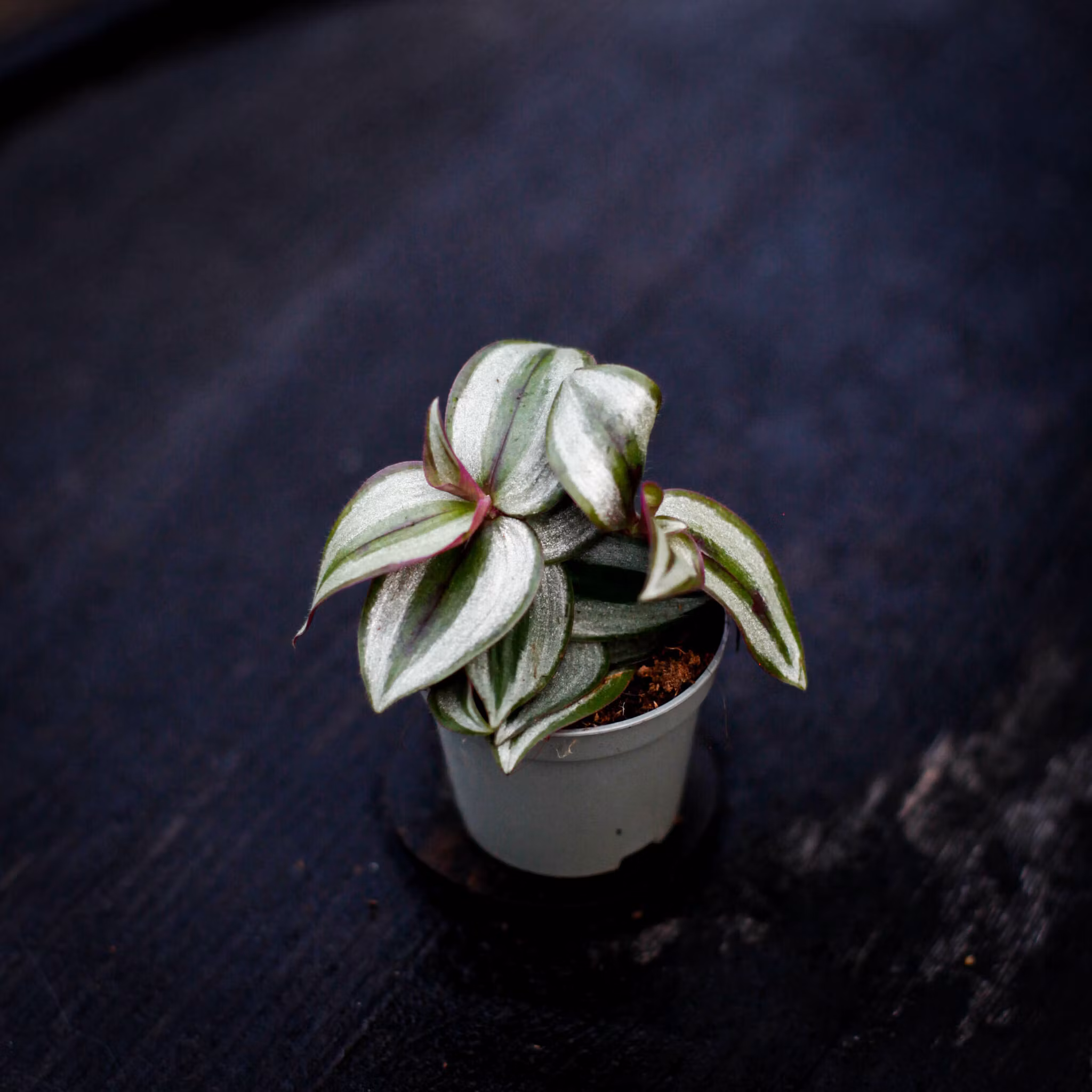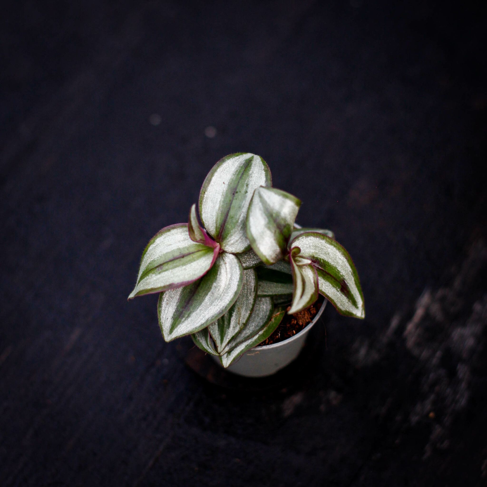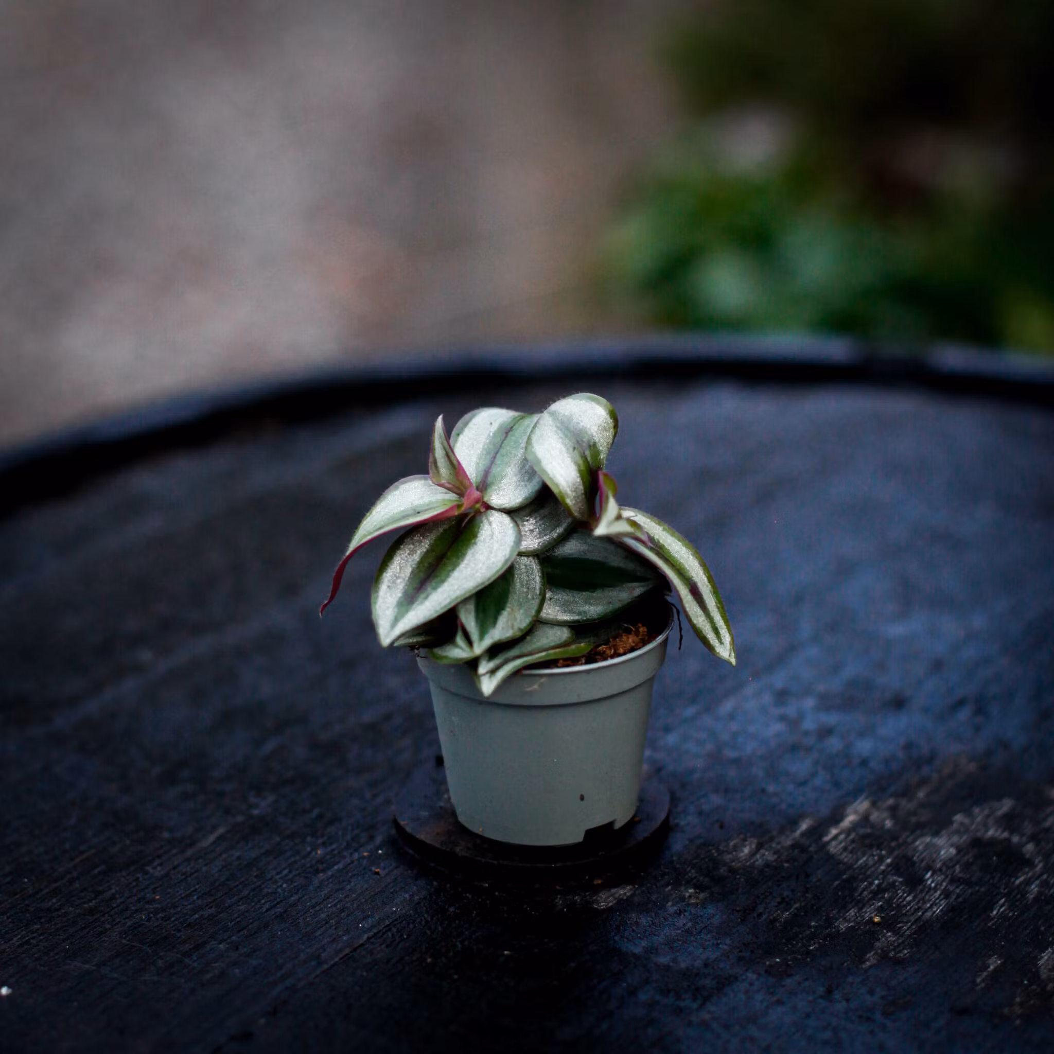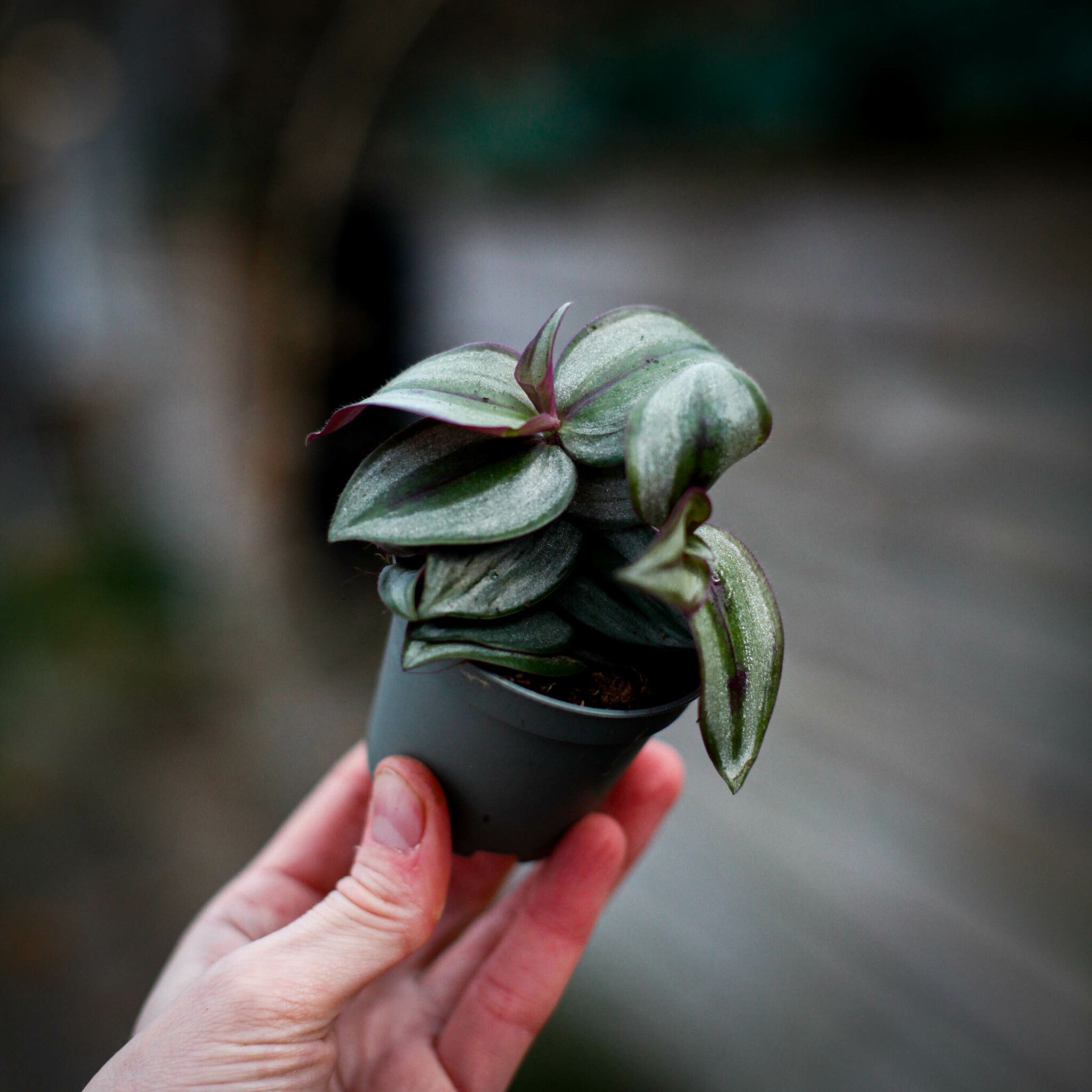 Upptäck Tradescantia zebrina 'Pink Joy' 6 cm, en lättskött skönhet med lila-silvriga blad. Perfekt för nybörjare, ger liv och färg till ditt hem.