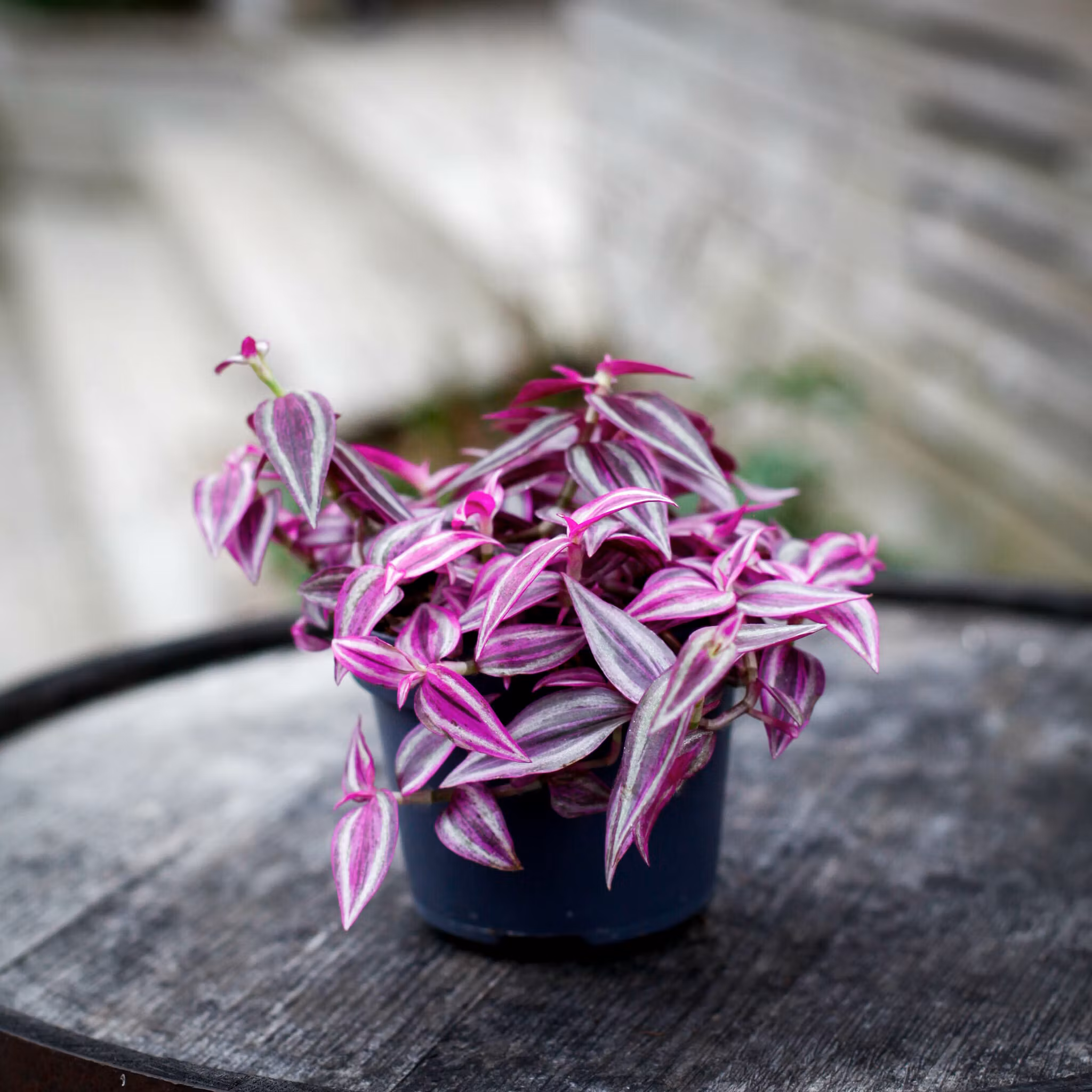 Upptäck Tradescantia 'Pink Paradise' 12 cm, hos Klorofyllverket. Med sina rosa-lila blad är den perfekt för nybörjare och skapar en färgsprakande atmosfär.
