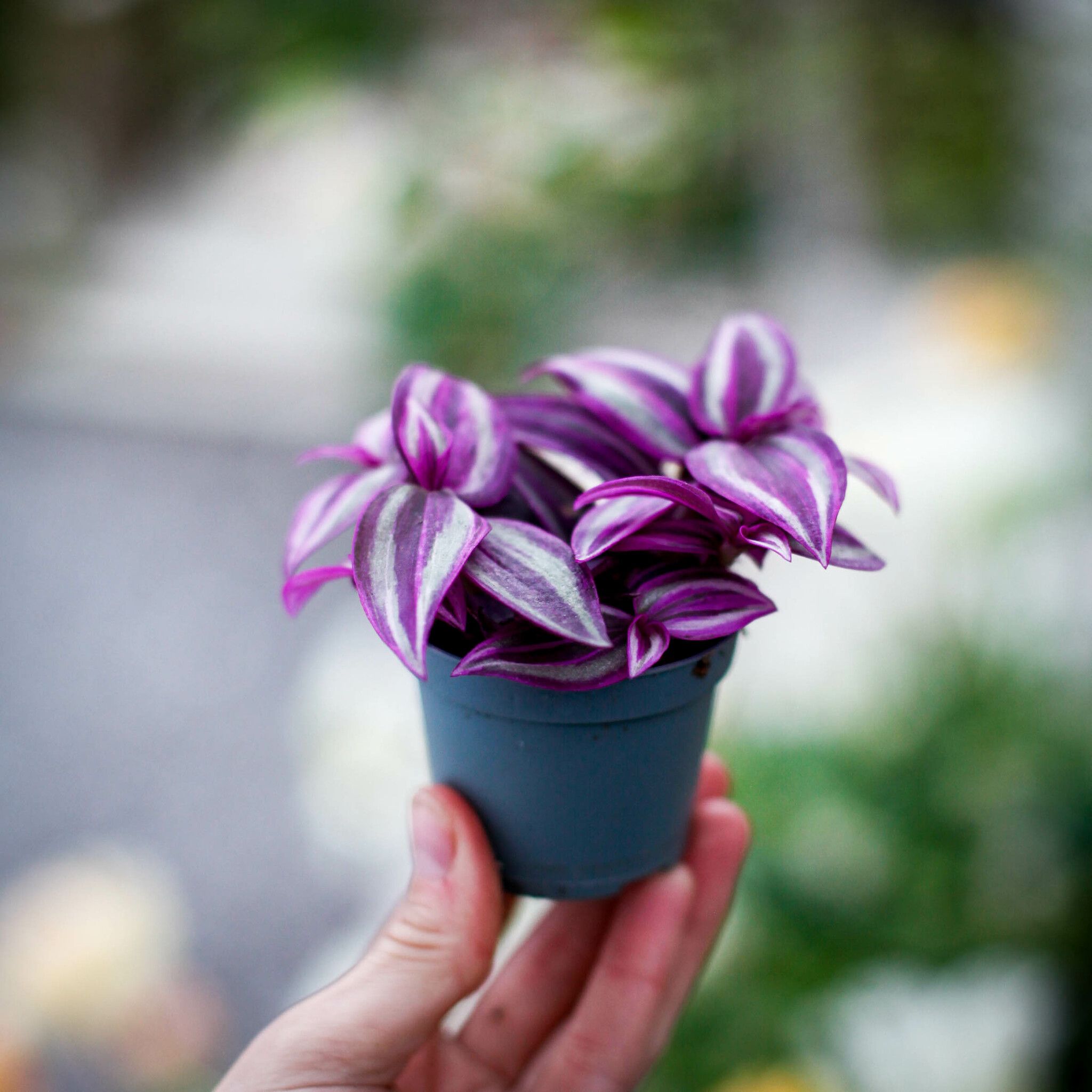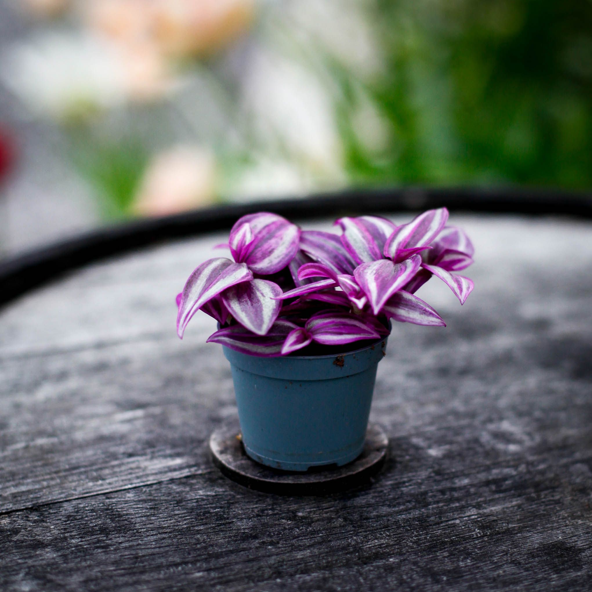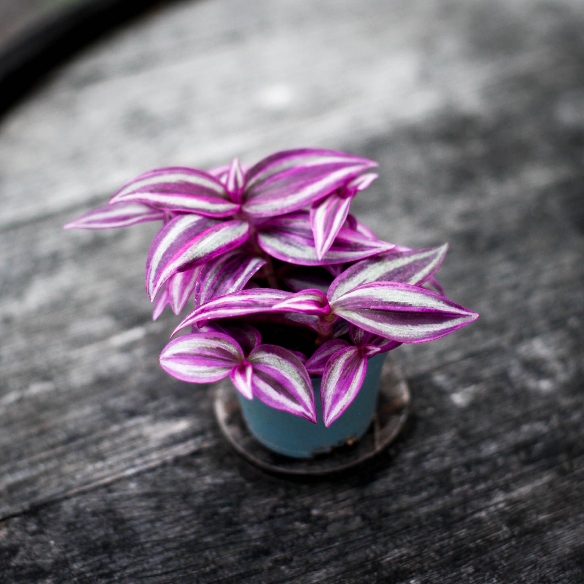 Upptäck Tradescantia 'Pink Paradise' 6 cm, hos Klorofyllverket. Med sina rosa-lila blad är den perfekt för nybörjare och skapar en färgsprakande atmosfär.