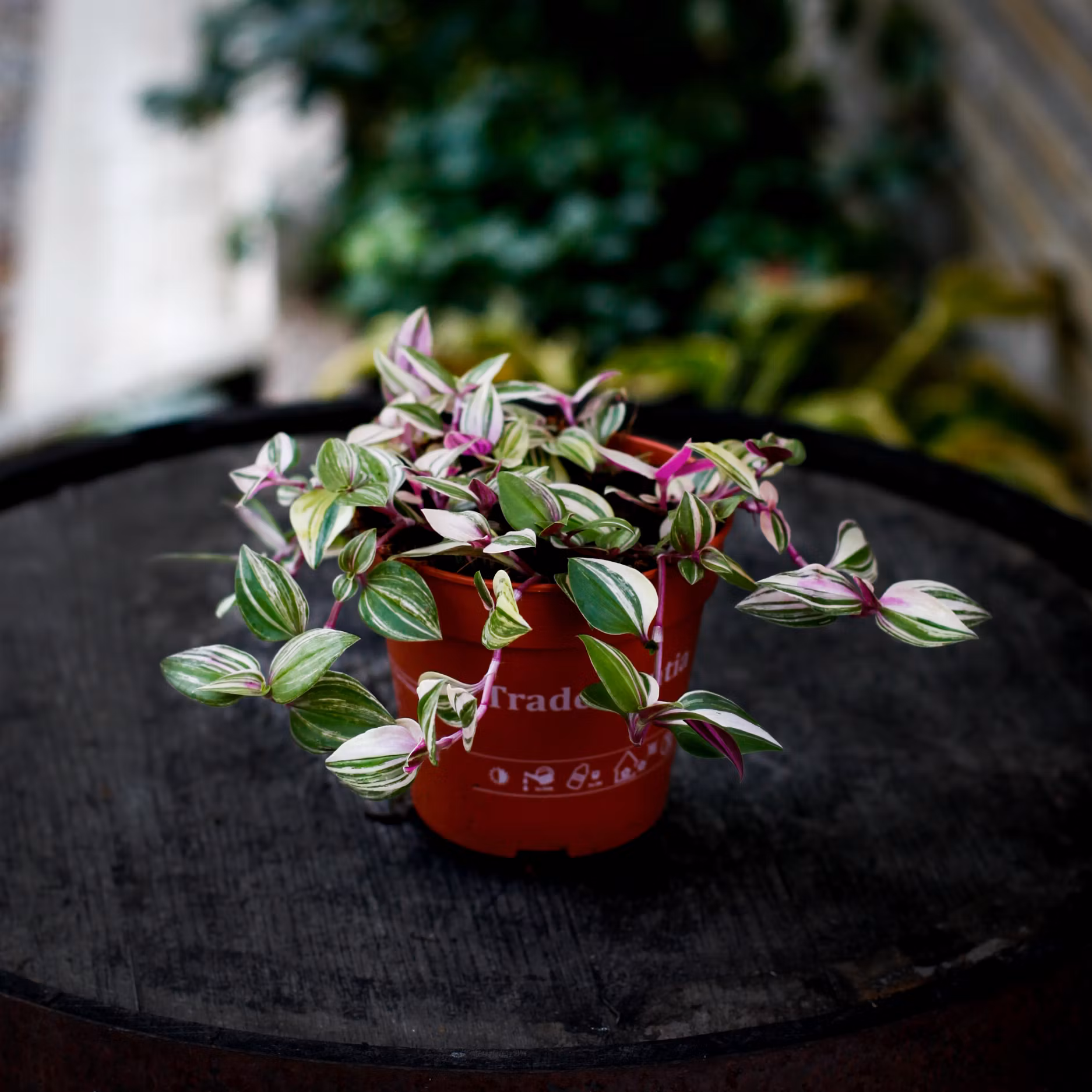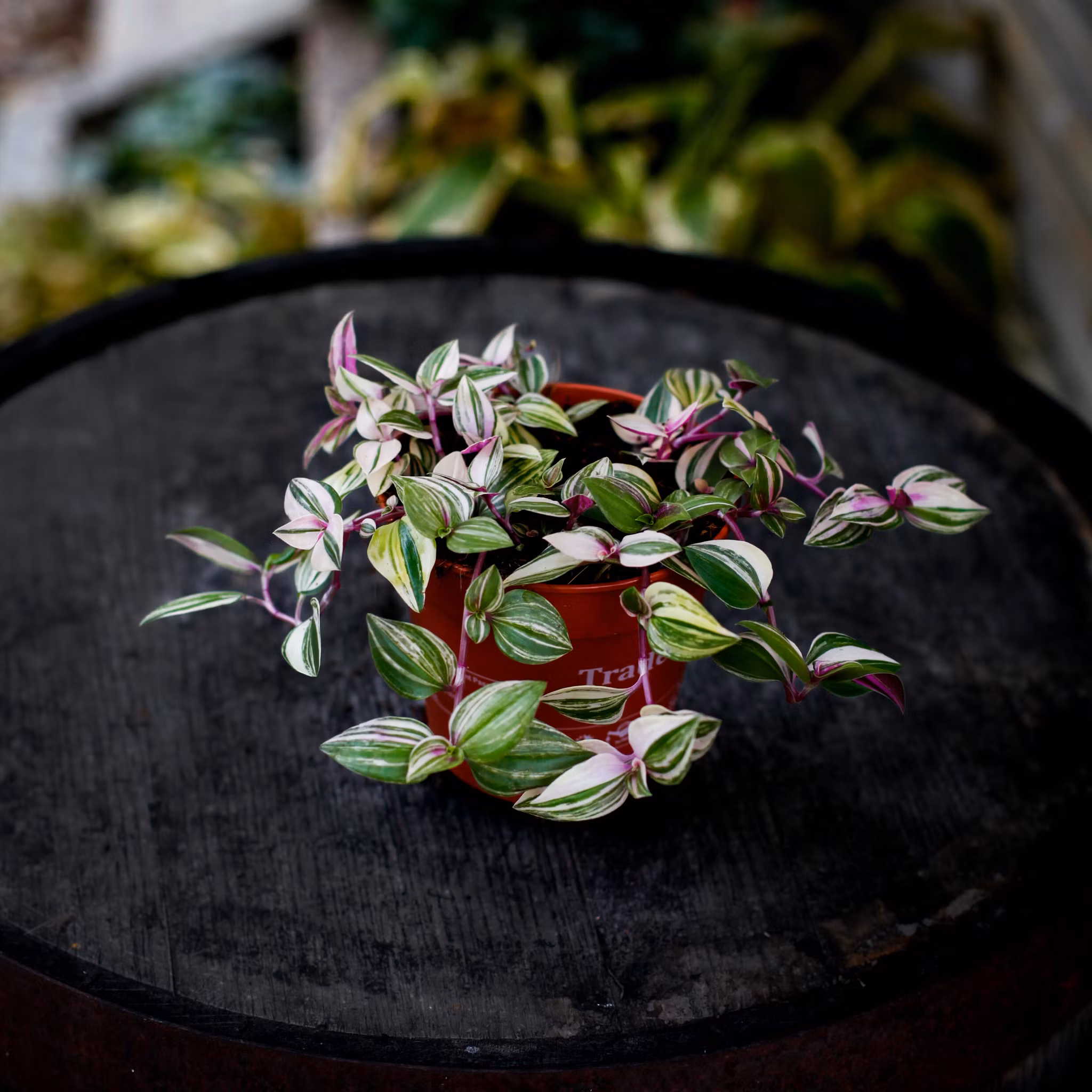 Tradescantia 'Tricolor' är en slående växt som utmärker sig med sina vackra blad i flera färger. Bladen kombinerar nyanser av grön, rosa och vit, vilket skapar en härlig och livfull kontrast. Den sprider sig gärna med sina hängande eller krypande stammar och blir en fin prydnad på hyllor, fönsterbrädor eller i ampel.