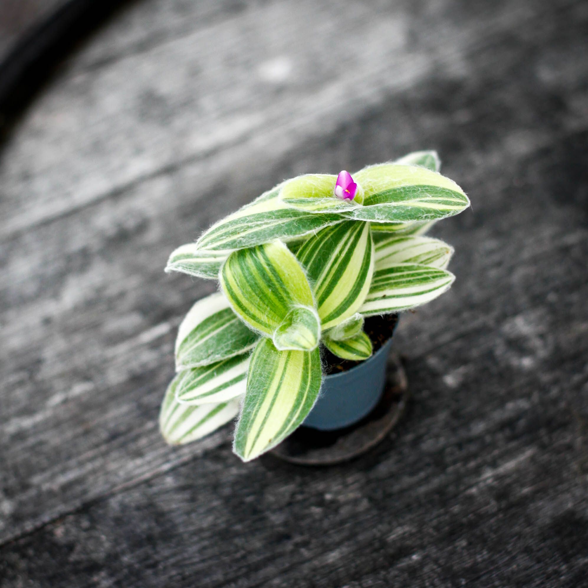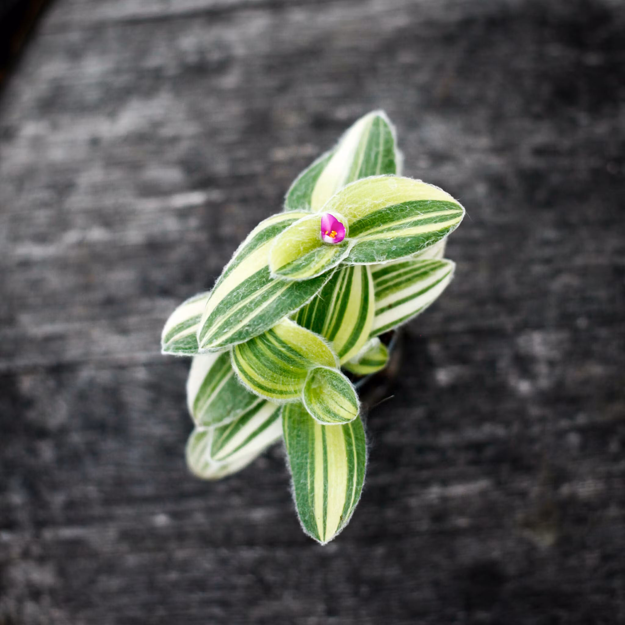 Tradescantia sillamontana 'Variegata' är en ovanlig och dekorativ variant av den klassiska "vittåtel"-växten, känd för sina silvriga hår och brokiga blad. Med sitt filtiga, ludna bladverk i nyanser av grågrönt, vitt och ibland svagt rosa, ger den ett unikt och nästan sagolikt intryck. En perfekt växt för samlaren eller den som vill ha något annorlunda men lättskött.