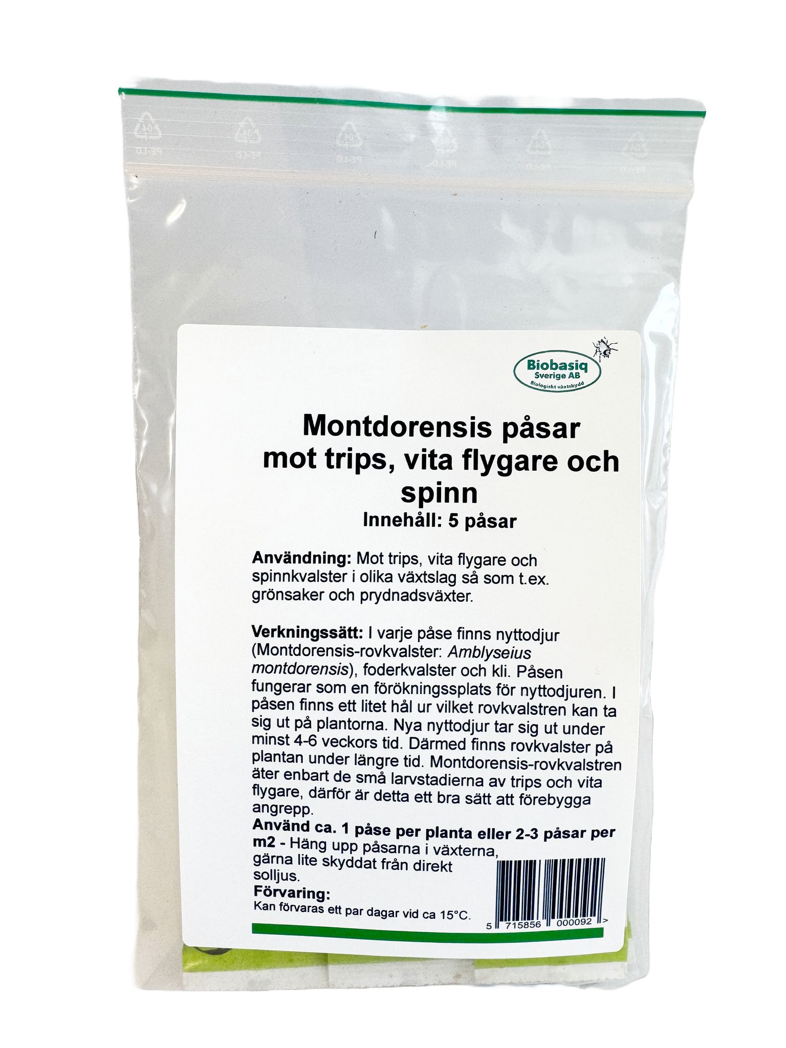 Montdorensis är tåliga och fungerar både i växthus, uterum och inomhusmiljö. De levereras i slow release-påsar som fungerar som små depåer och släpper ut rovkvalster successivt under 4–6 veckor.