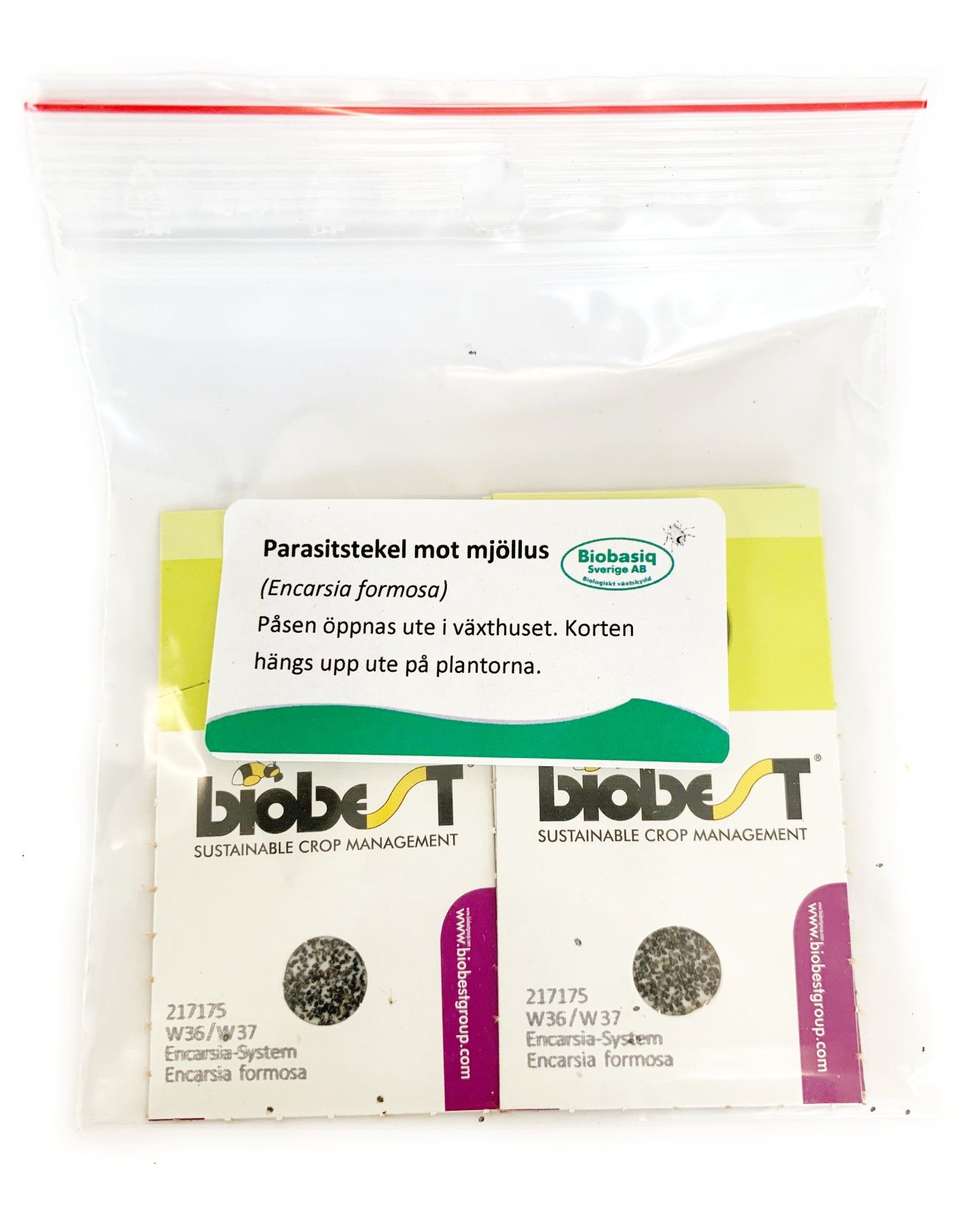 Encarsia formosa är en parasitstekel på ca 1 mm som levereras som svarta puppor ("black scales") fastklistrade på kort. När de kläcks söker steklarna aktivt upp larver av vita flygare och lägger sina ägg inuti dem. På så sätt stoppas skadedjurens livscykel och populationen minskar successivt.