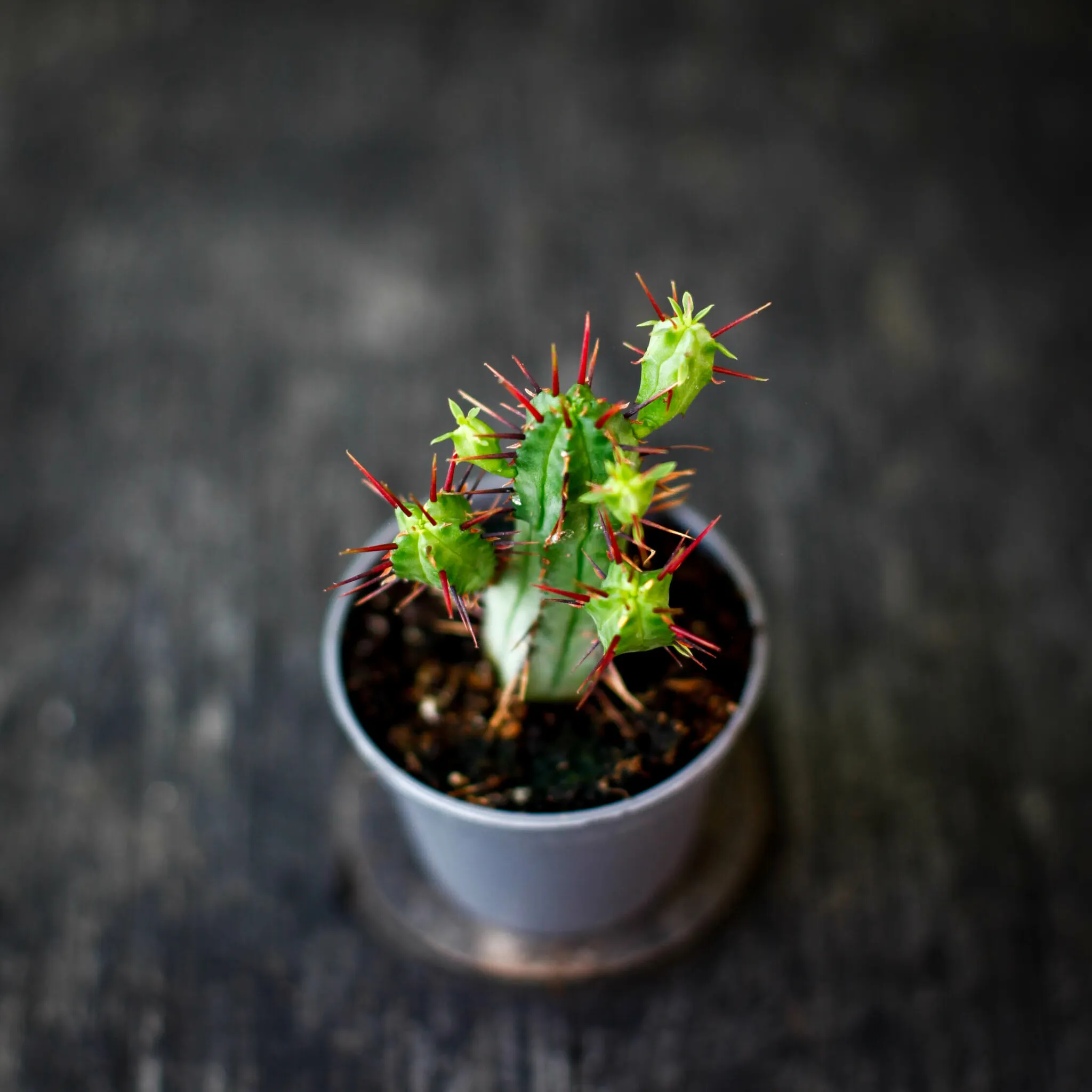 De flesta är ofarliga, men vissa – som Euphorbia tirucalli – har växtsaft som kan irritera hud och slemhinnor. Ställ dem utom räckhåll för djur och små barn.