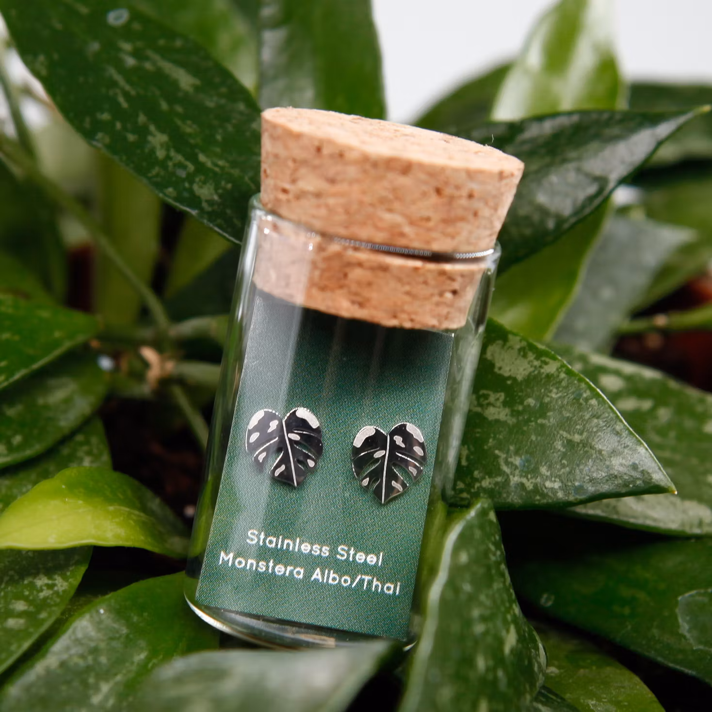 Örhängen i form av ett Monstera Albo/Thai-blad, med detaljer som följer bladets karakteristiska form. Finns i två allergivänliga materialvarianter: rostfritt stål och 18k guldplätering. Båda alternativen är anpassade för känsliga öron och behåller sin finish över tid. Levereras i en glasburk med korktopp.