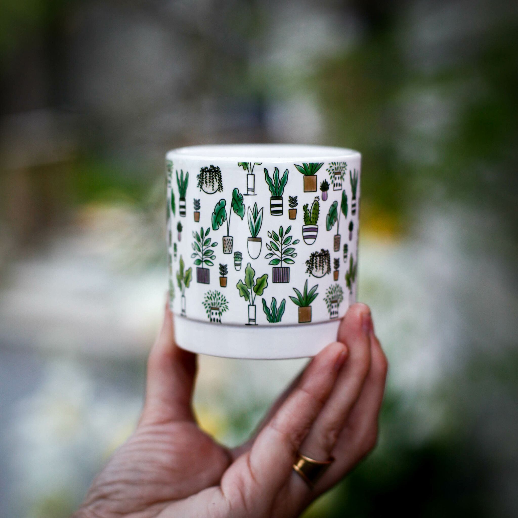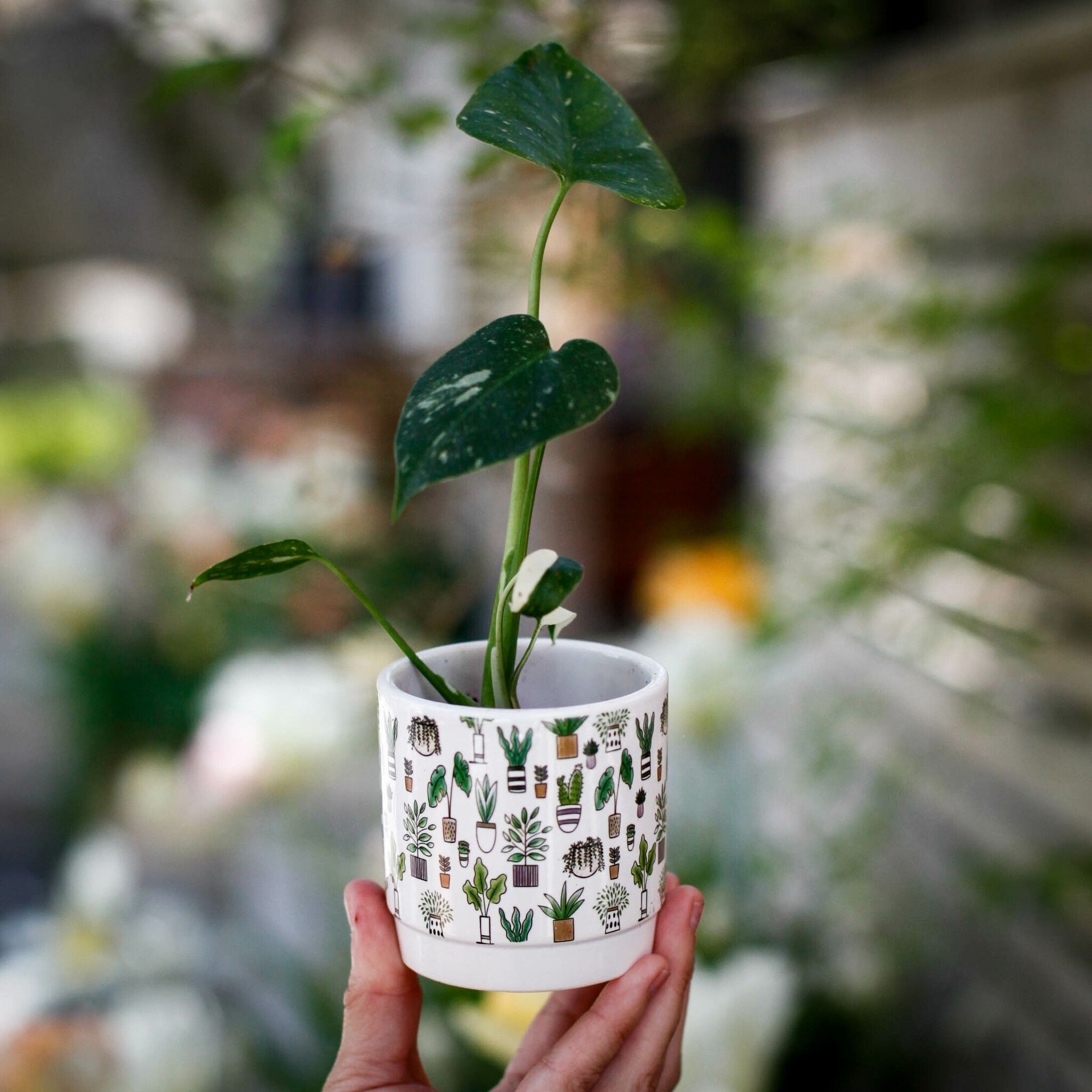 Minikruka för krukväxter: Perfekt för sticklingar och suckulenter. Rund, vit med växtmotiv. Passar 6 cm. Idealisk för fönsterbrädan. Växter ingår ej.