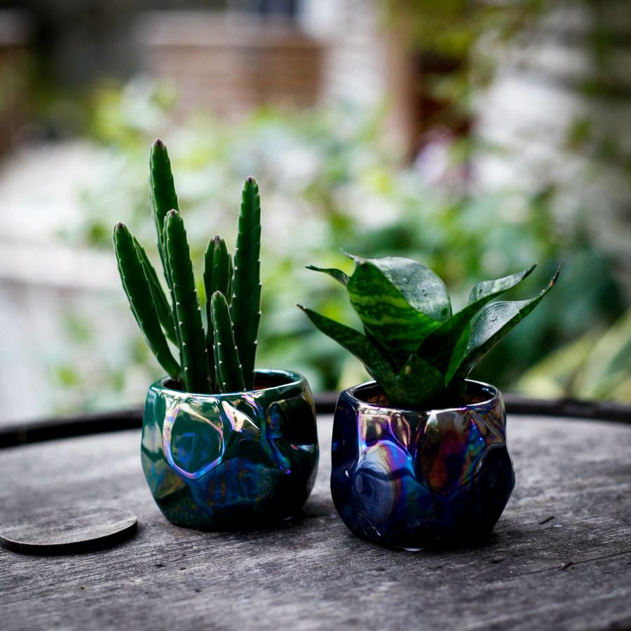 Denna minikruka med skimrande metallicglasyr är ett stilfullt val för dig som söker en liten kruka till sticklingar, suckulenter eller kaktusar. De metalliska tonerna i blått och grönt ger krukan ett modernt uttryck som lyfter små växter och skapar en elegant växtdisplay.
