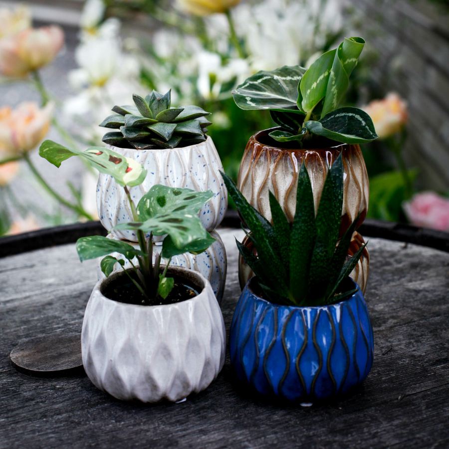 Denna minikruka är anpassad för 6 cm krukväxter och passar perfekt för sticklingar, suckulenter och kaktusar. De jordnära färgkombinationerna i sand, blått och brunt ger ett lugnt och naturligt uttryck.