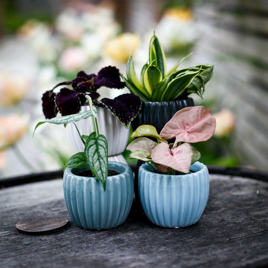 Minikruka för 6 cm växter: Perfekt för sticklingar och kaktusar. Stilren design i blått, grönt, grått och vitt. Idealisk för fönsterbrädan eller skrivbordet.