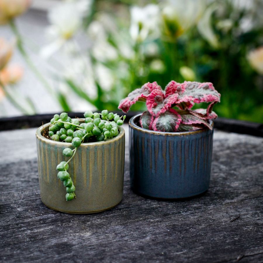 Minikruka för 6 cm krukväxter, perfekt för sticklingar och suckulenter. Unika färgkombinationer i blått och grönt. Dekorativ och platsbesparande.