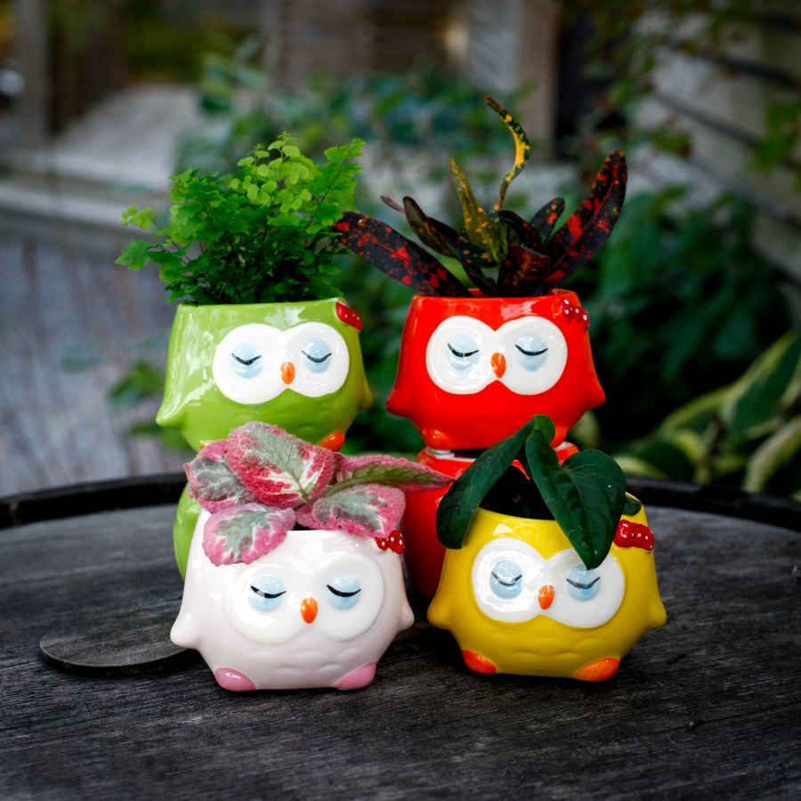 Minikruka i uggleform, perfekt för sticklingar och suckulenter. Passar krukstorlek 6 cm. Finns i rosa, gul, orange och grön. Unik keramikdesign.