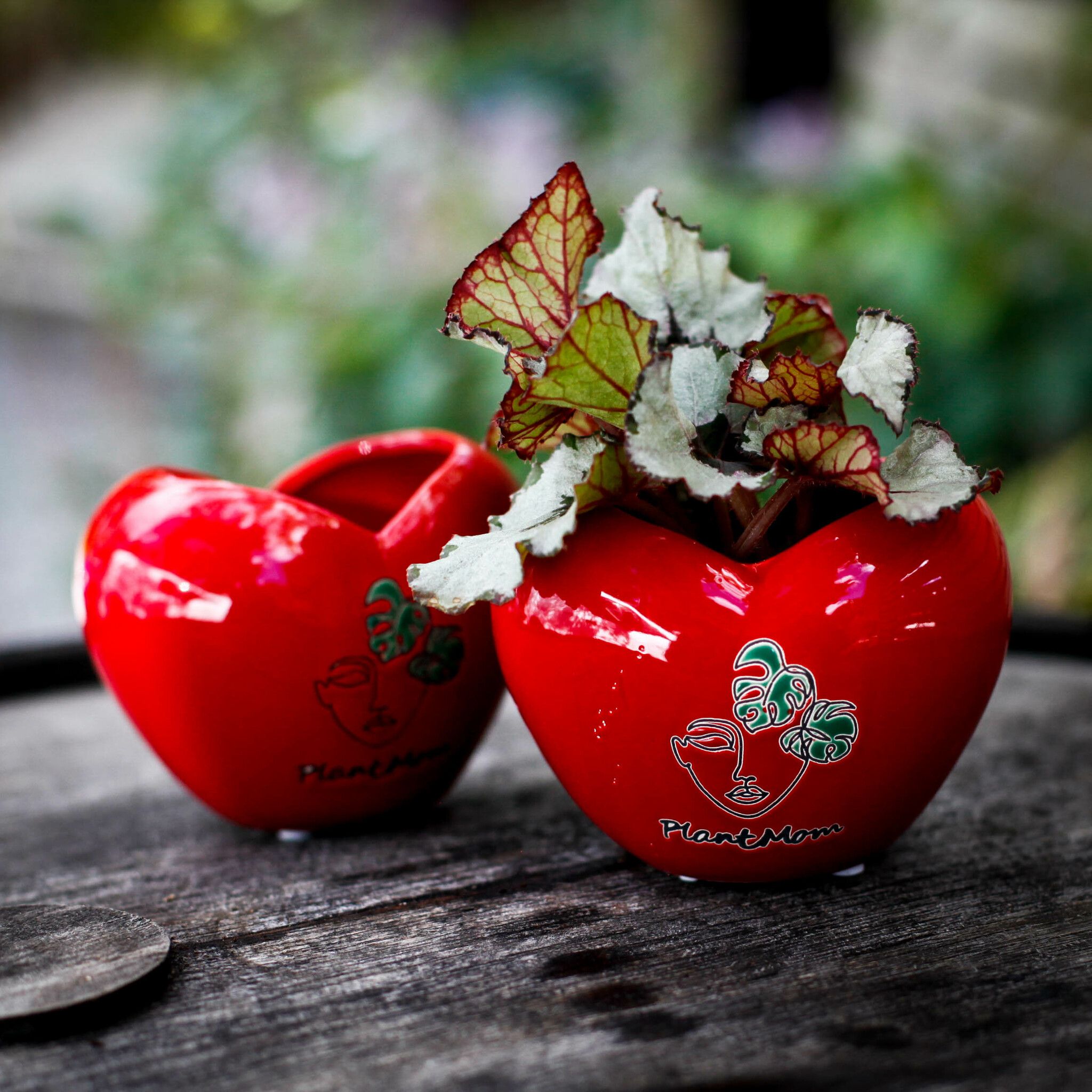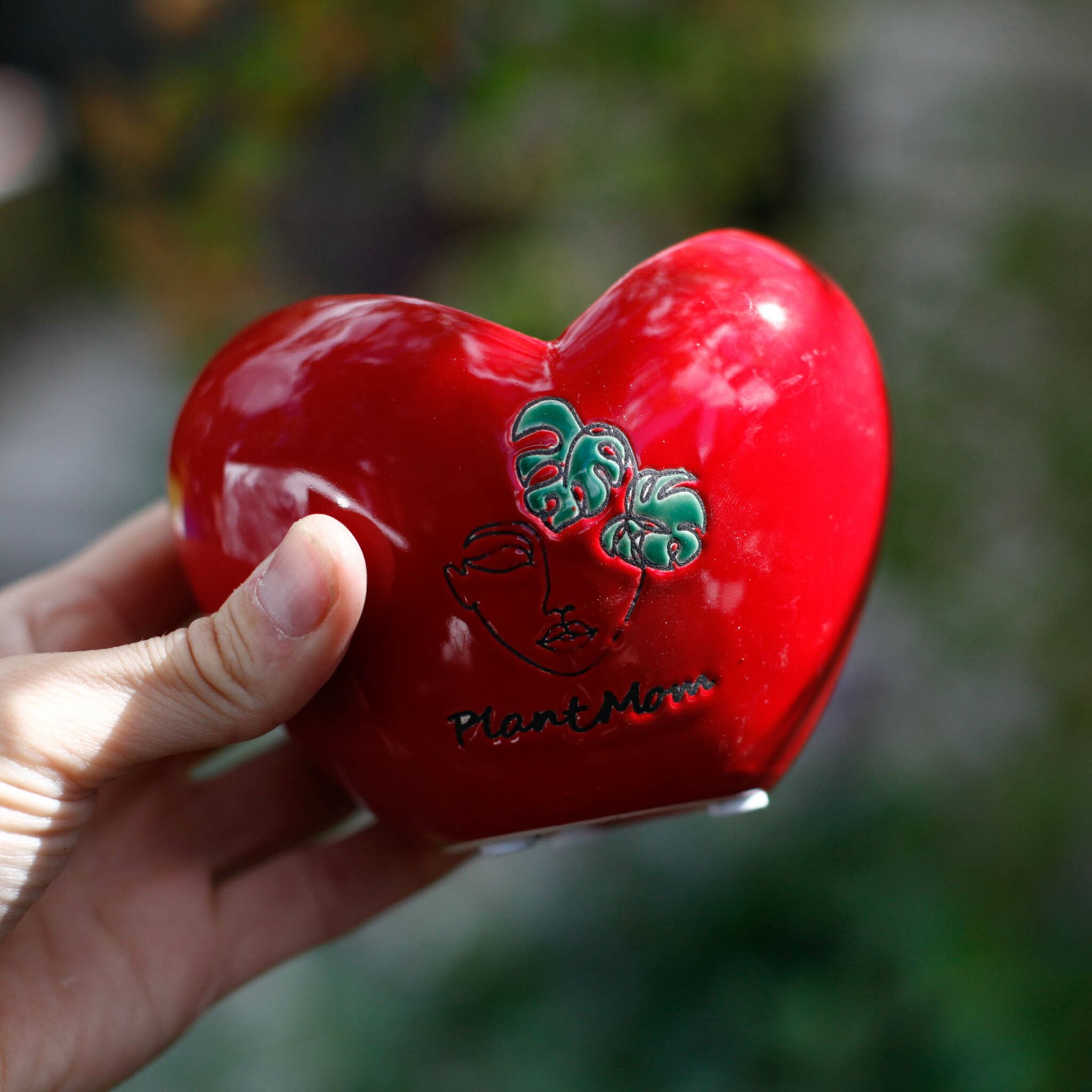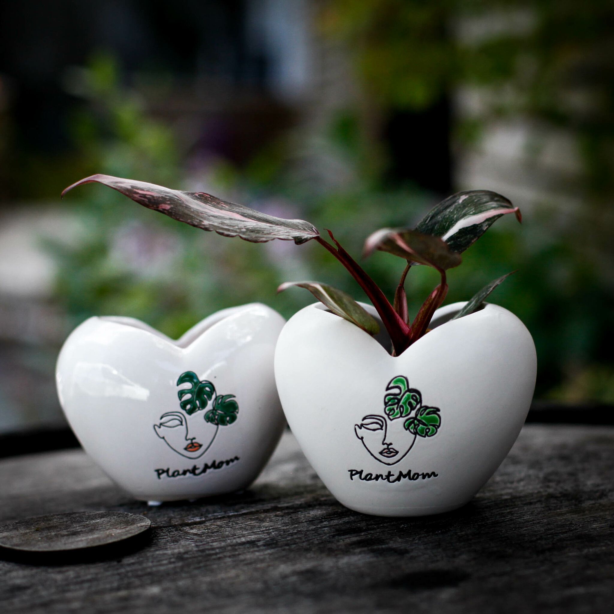 Minikruka Plantmom hjärta, perfekt för sticklingar och suckulenter, i andrahandssortering. Unika färgskiftningar ger varje kruka sin charm.