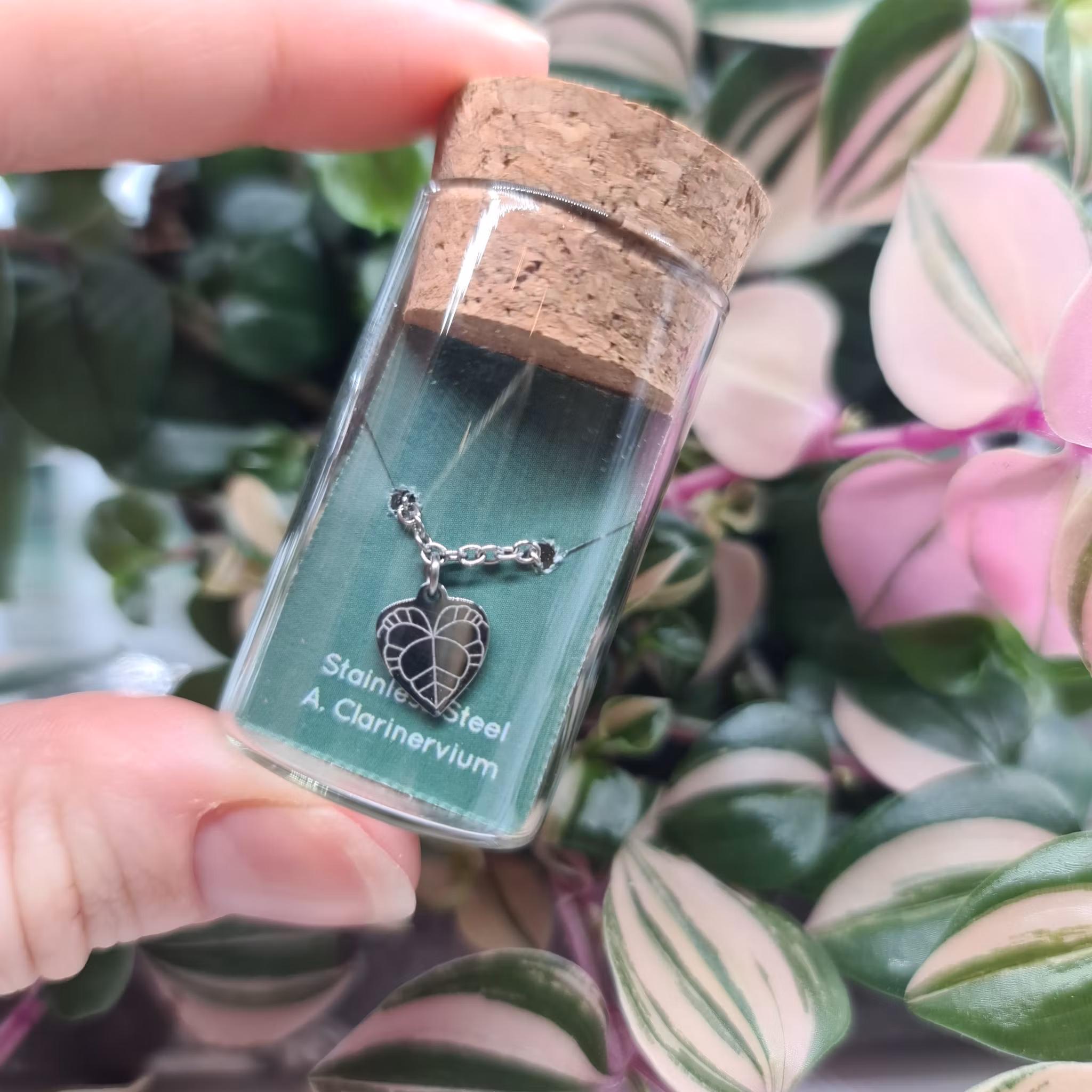 Tidlösa armband för växtälskaren! Vackert allergivänligt armband i rostfritt stål, formad som Anthurium clarinervium. Levereras i en glasburk med korktopp.