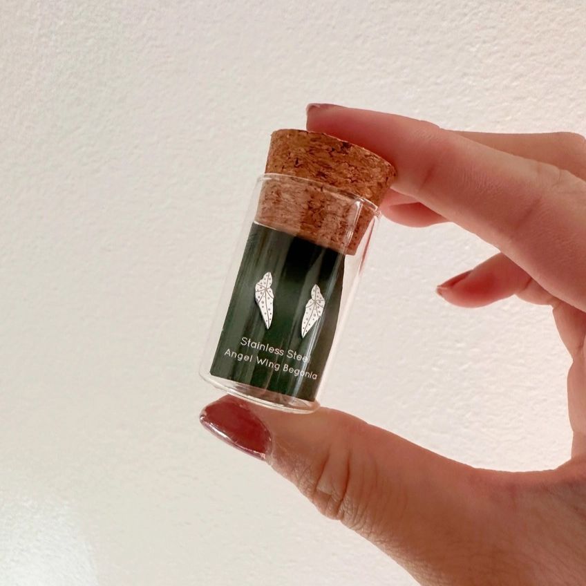 Tidlösa örhängen för växtälskaren! Allergivänliga Begonia Angelwings i rostfrittstål. Levereras i en glasburk som kan användas som sticklingstation.
