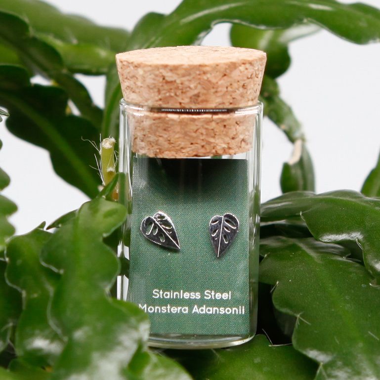 Tidlösa örhängen för växtälskaren! Allergivänliga örhängen i rostfritt stål, formade som Monstera Adansonii. Levereras i glasburk med korktopp.