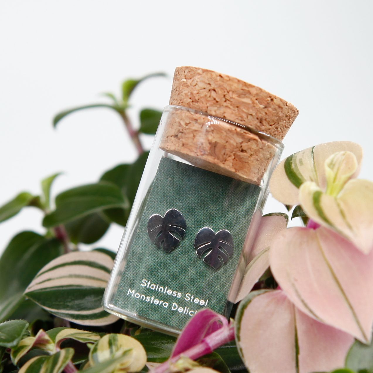 Tidlösa örhängen för växtälskaren! Vackra allergivänliga örhängen i rostfritt stål i form av Monstera Deliciosa. Levereras i glasburk med korktopp.