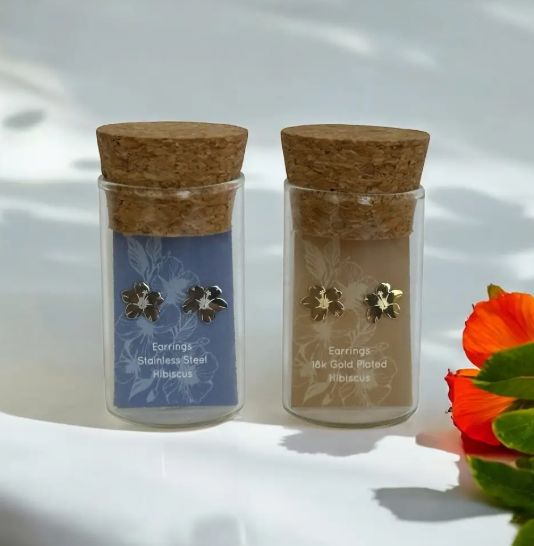 Tidlösa örhängen i rostfritt stål med Hibiscus-design. Perfekta för växtälskare! Levereras i glasburk som kan bli en sticklingstation. Storlek: 8x5mm.