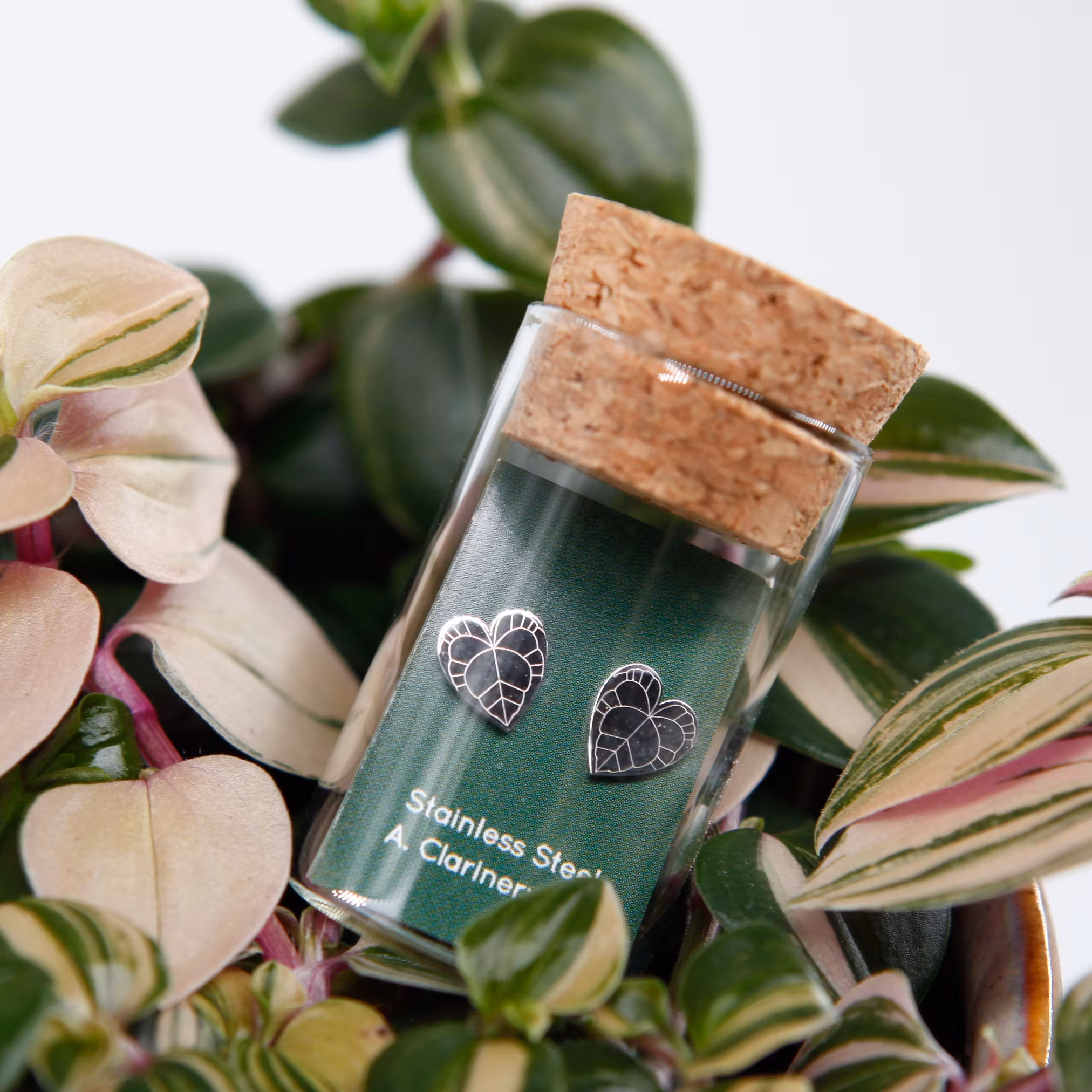 Tidlösa örhängen för växtälskaren! Vackra allergivänliga örhängen i rostfritt stål formade som Anthurium clarinervium. Levereras i glasburk med korktopp.