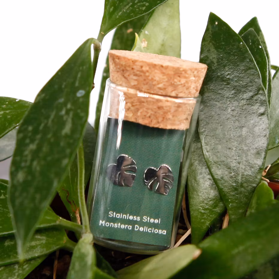 Örhängen i form av ett Monstera Deliciosa-blad, med detaljer som följer bladets karakteristiska flikar. Finns i två allergivänliga materialvarianter: rostfritt stål och 18k guldplätering. Båda alternativen är anpassade för känsliga öron och behåller sin yta över tid. Levereras i en glasburk med korktopp.