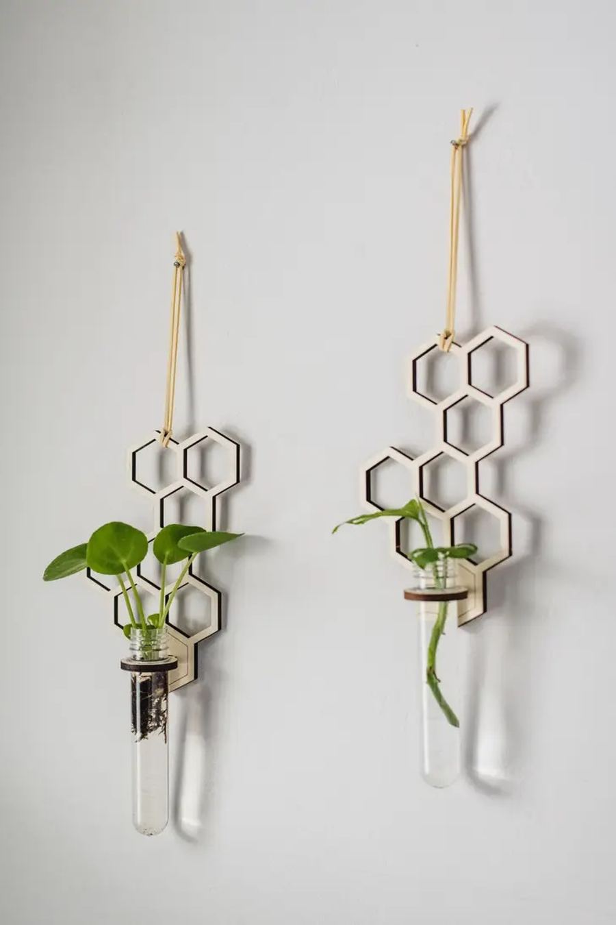 Smycka dina väggar med växtförökningens magi. Denna hängande förökningsstation har en elegant bikakebakgrund och kommer med ett stort provrör för dina sticklingar.
