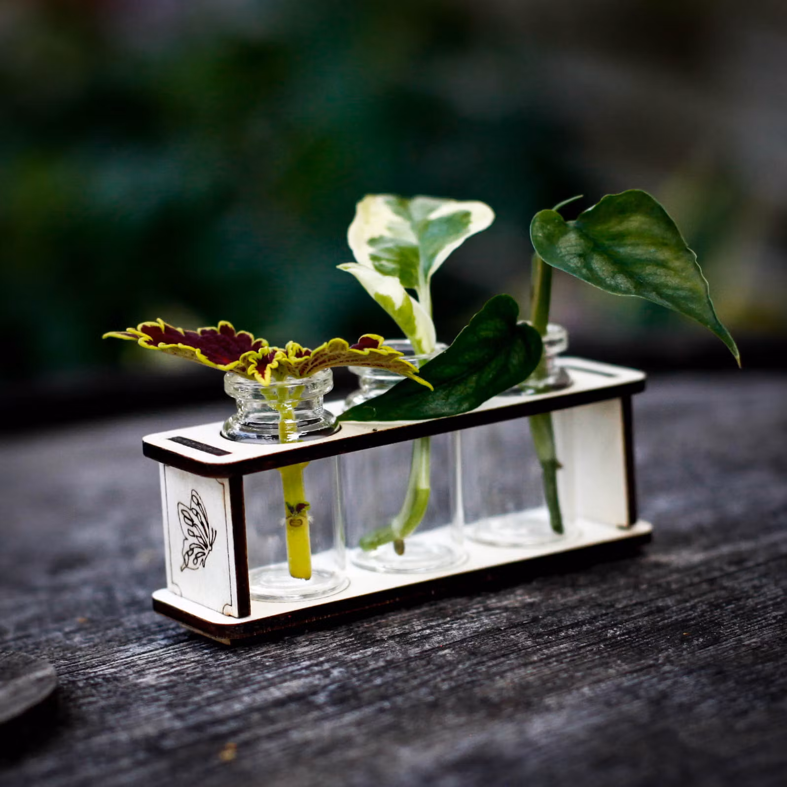 Sticklings- och doftstation med fjärilar – en unik present för växtälskare. Handgjord i trä med glasbehållare och fjärilsdiffusorer. Perfekt för hemmet.