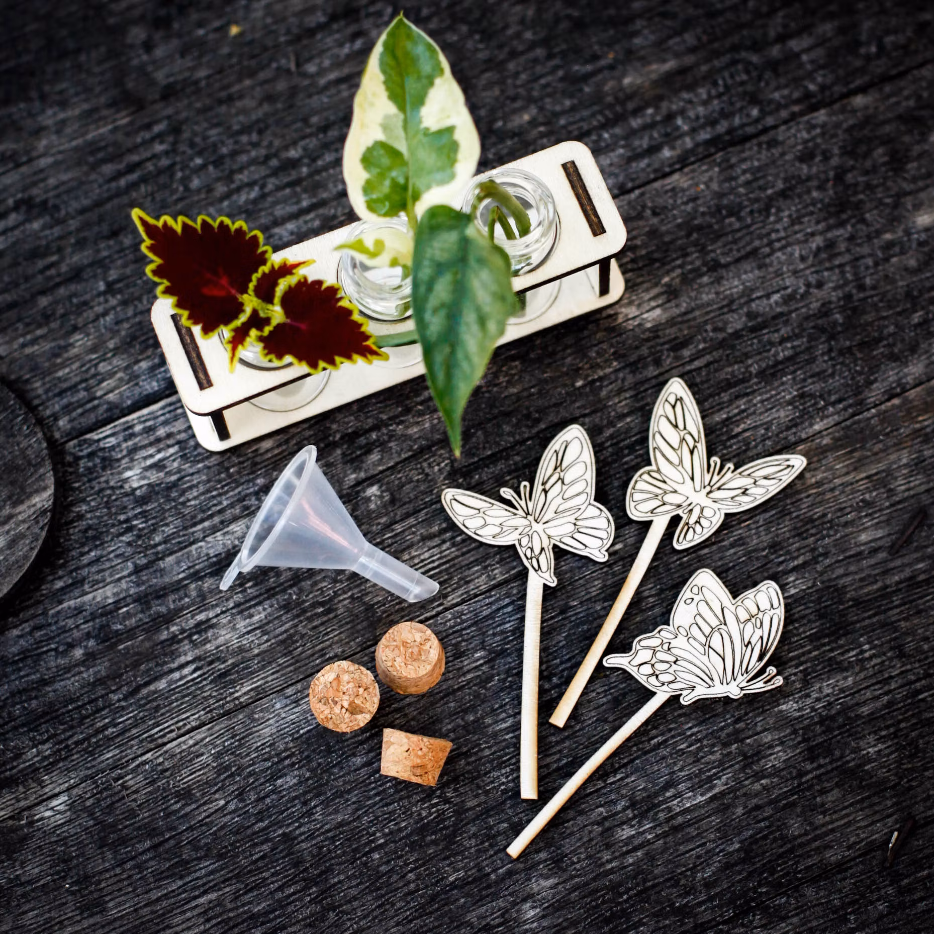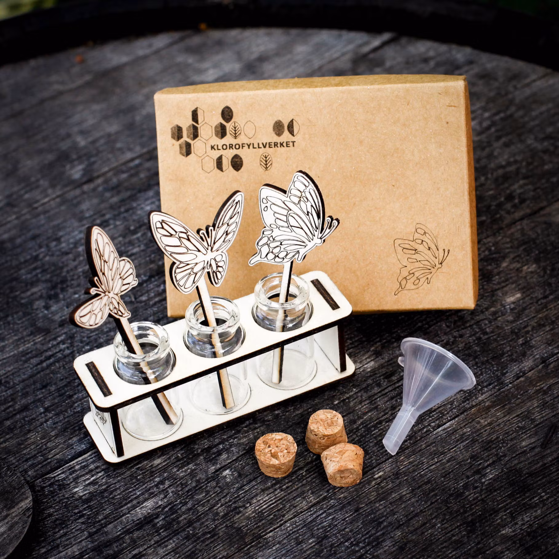 En charmig mini sticklings- och doftstation dekorerad med fjärilar – den perfekta gåvan för växtälskaren som redan har allt. Setet levereras i en elegant presentask och kombinerar både funktion och estetik på ett lekfullt sätt.
