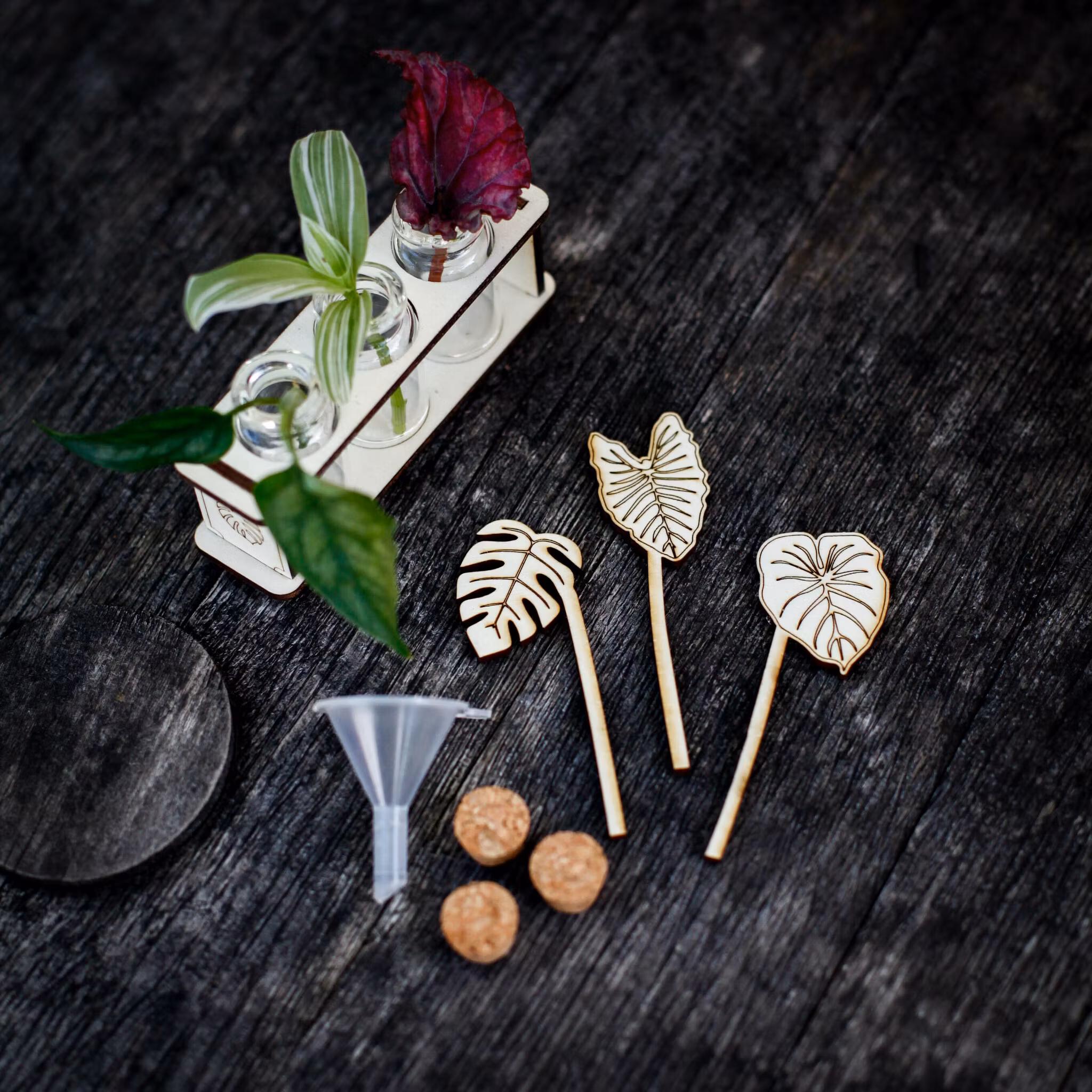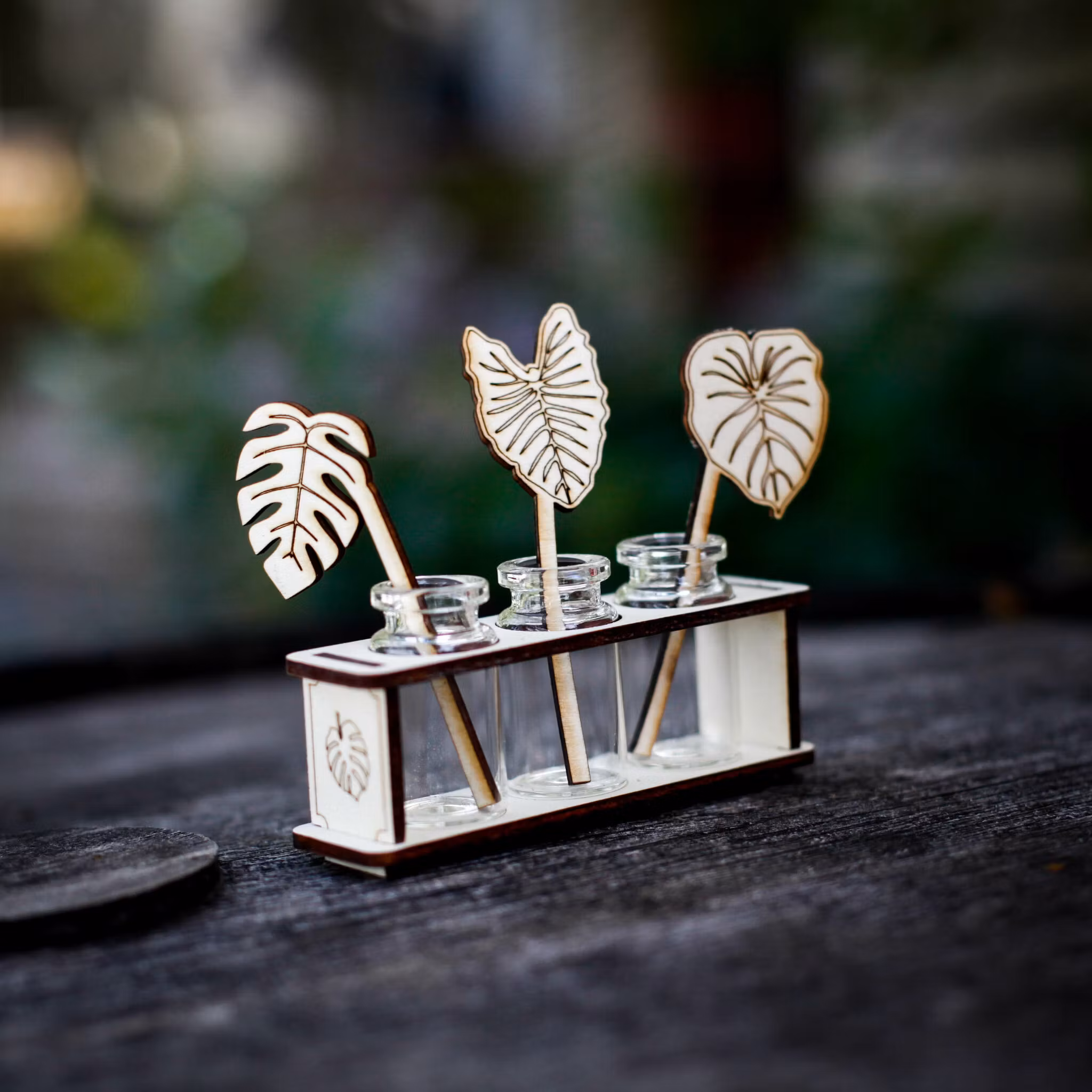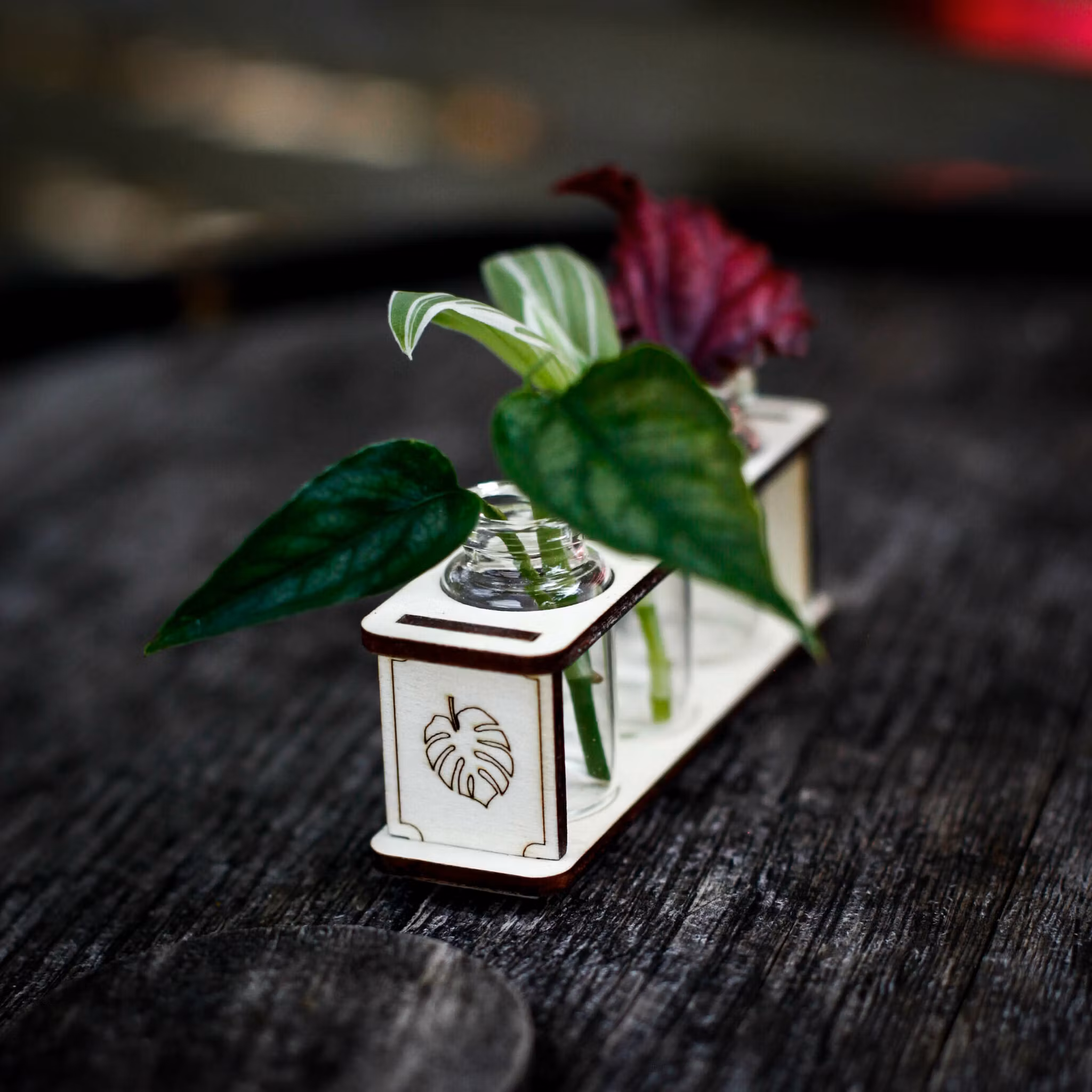 Unik Monstera-inspirerad sticklingsstation i trä med glasbehållare. Perfekt gåva för växtälskare. Beställ online hos Klorofyllverket.se.