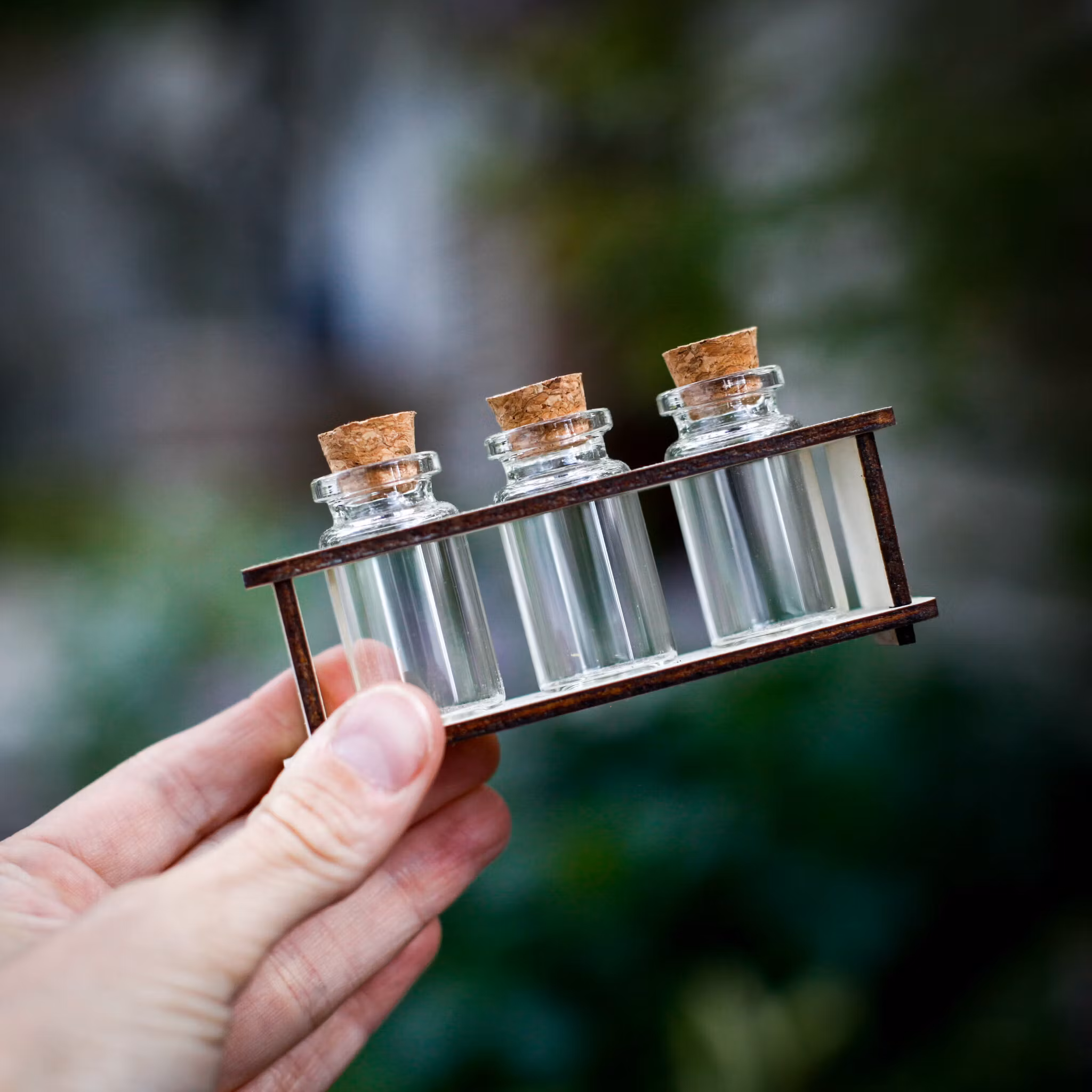Stationen är handgjord i trä och innehåller små glasbehållare med korktoppar. Till dessa hör trädiffusorer formade som dekorativa Monstera-blad, vilket gör att setet blir en liten inredningsdetalj i sig. Den kompakta storleken gör den extra söt och lättplacerad i alla hem.
