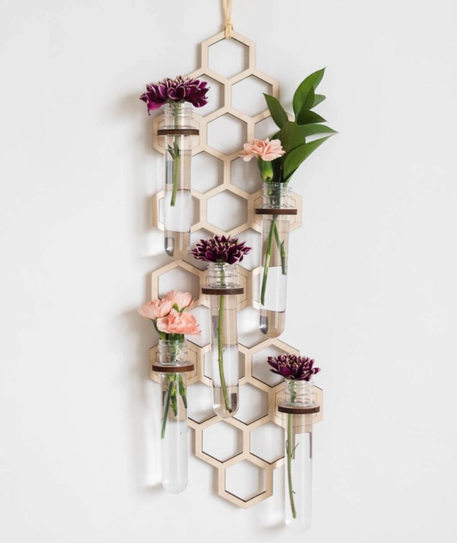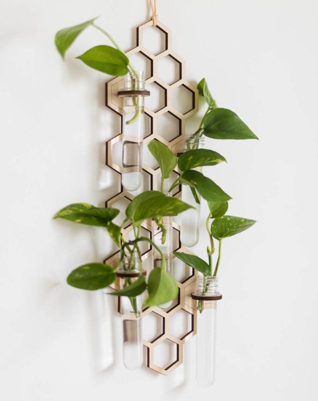 Smycka dina väggar med växtförökningens magi. Denna hängande förökningsstation har en elegant bikakebakgrund och kommer med fem stort provrör för dina sticklingar.