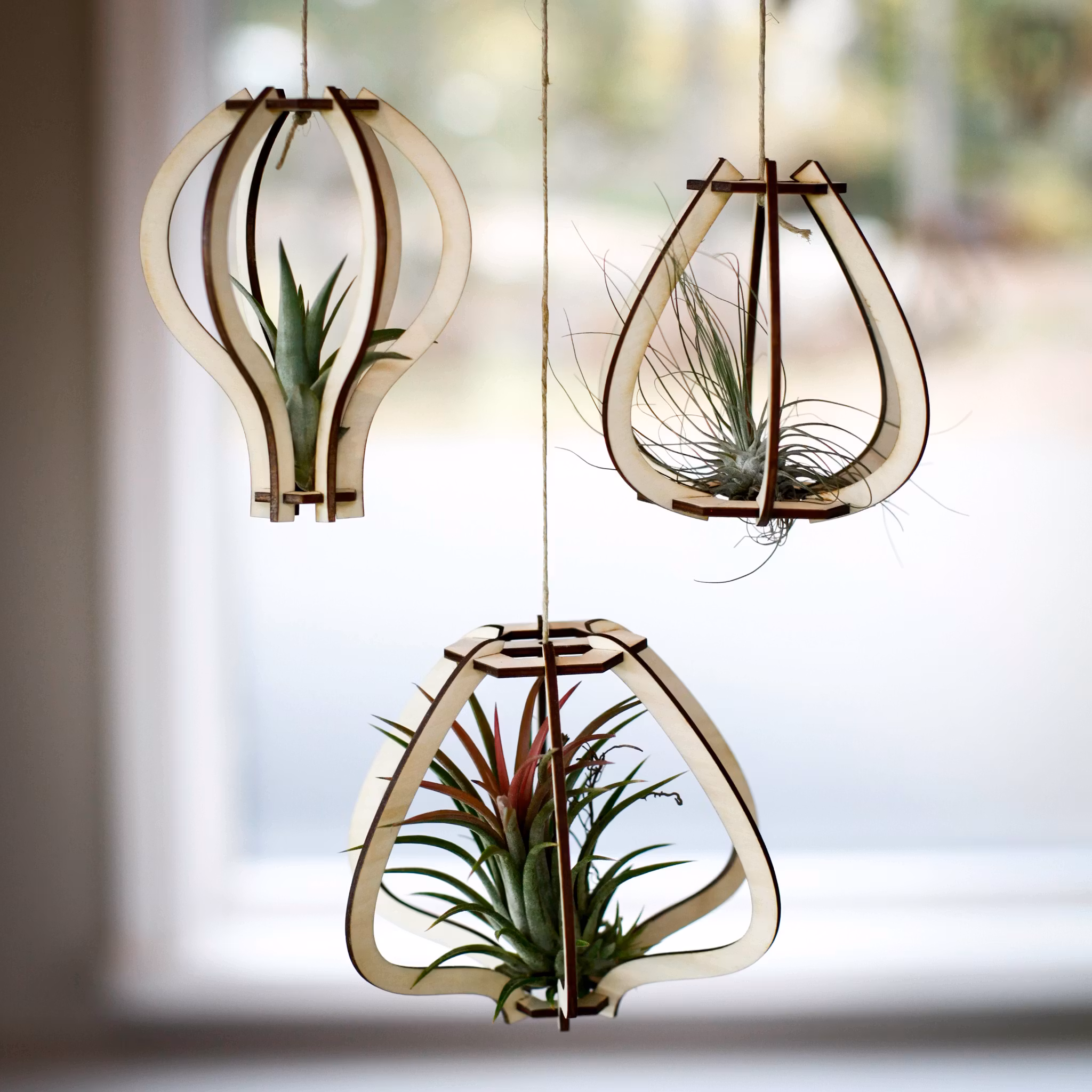 Handgjorda tillandsiahållare i trä från Klorofyllverket. Set om tre: liten, mellan, stor. Välj mörkt eller ljust trä. Perfekt för din växtvägg.