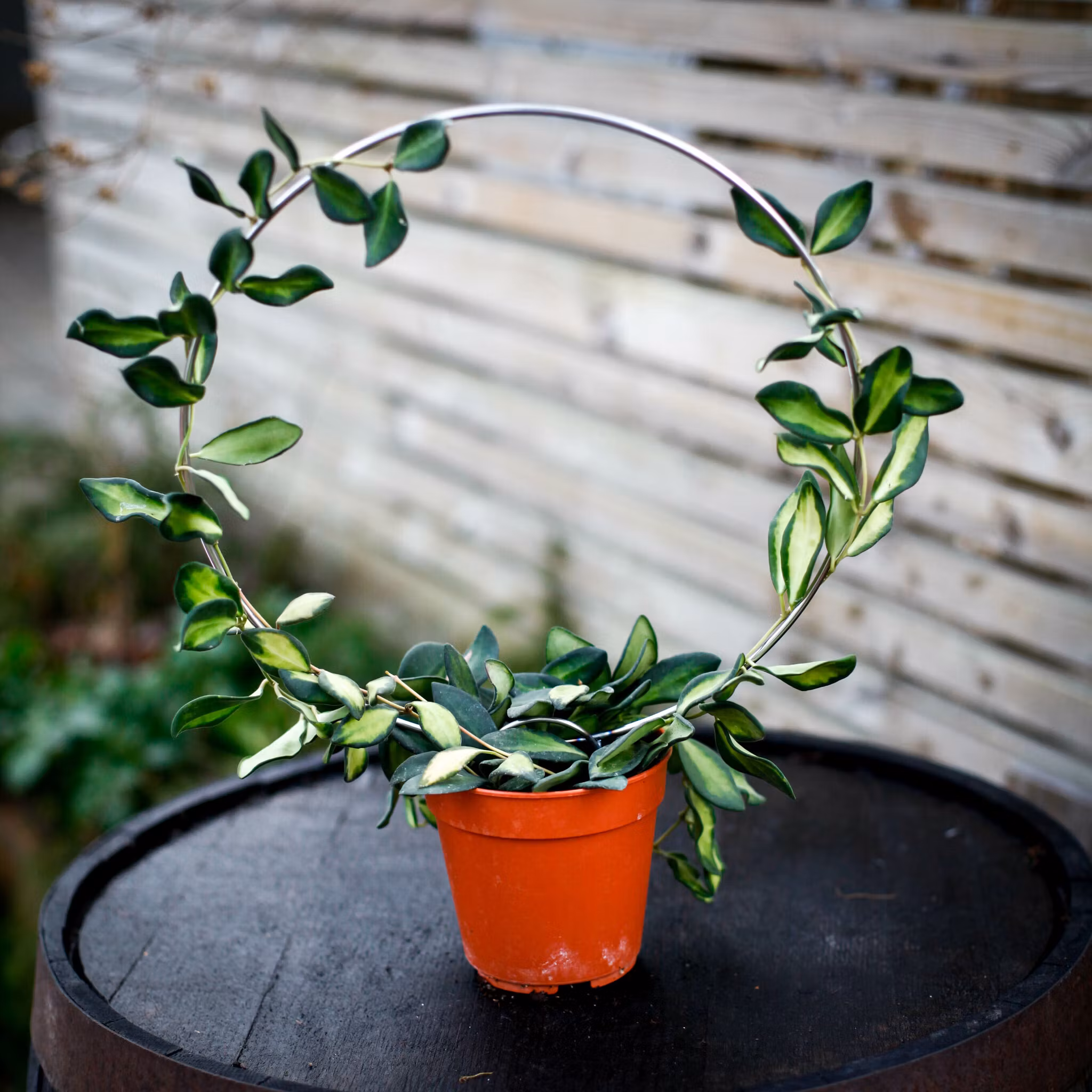 Denna stiliga krukspaljé i smide är formad som en cirkel och passar perfekt för att ge stöd åt dina slingerväxter. Med en diameter på 30 cm är den idealisk för Hoyor och andra växter som gärna klättrar och slingrar sig. Den diskreta designen gör att den smälter in i alla typer av inredningar, samtidigt som den ger ett praktiskt stöd för växterna. På bilden visas hur en Hoya DS70 slingrar sig runt spaljen.